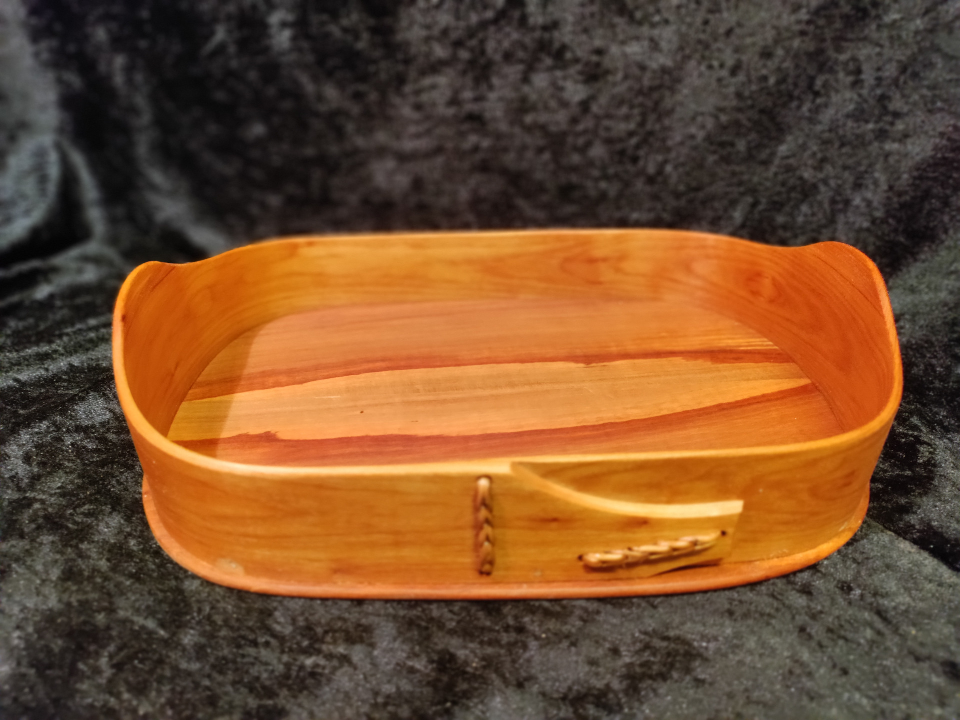 Svepfat ca 28x19cm. Svep av sälg, botten av päronträ.Linoljad.
