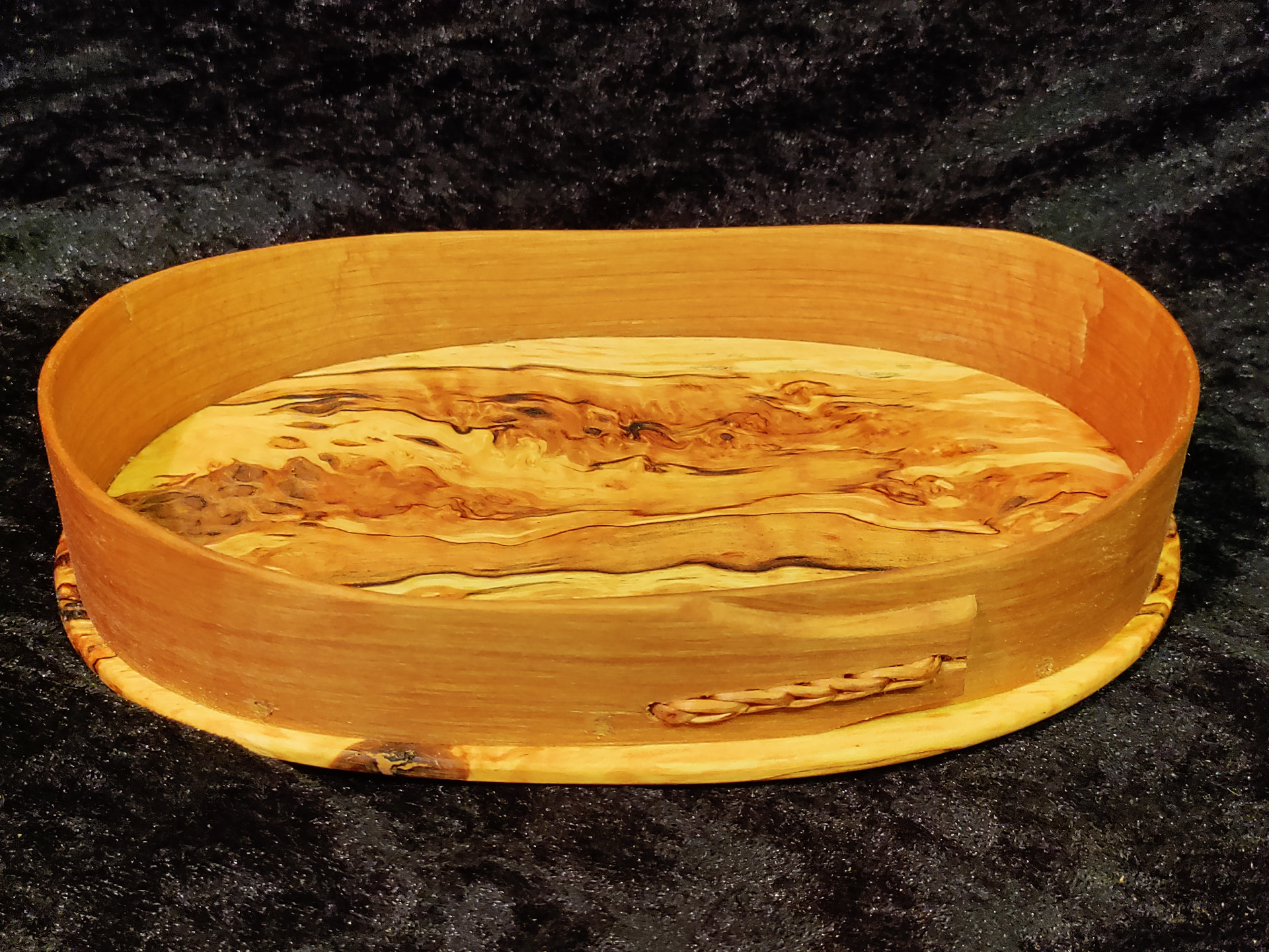 Svepfat ca 18x10 cm. Elliptisk med botten av lätt rötad masurbjörk, svep av sälg. Linoljad.