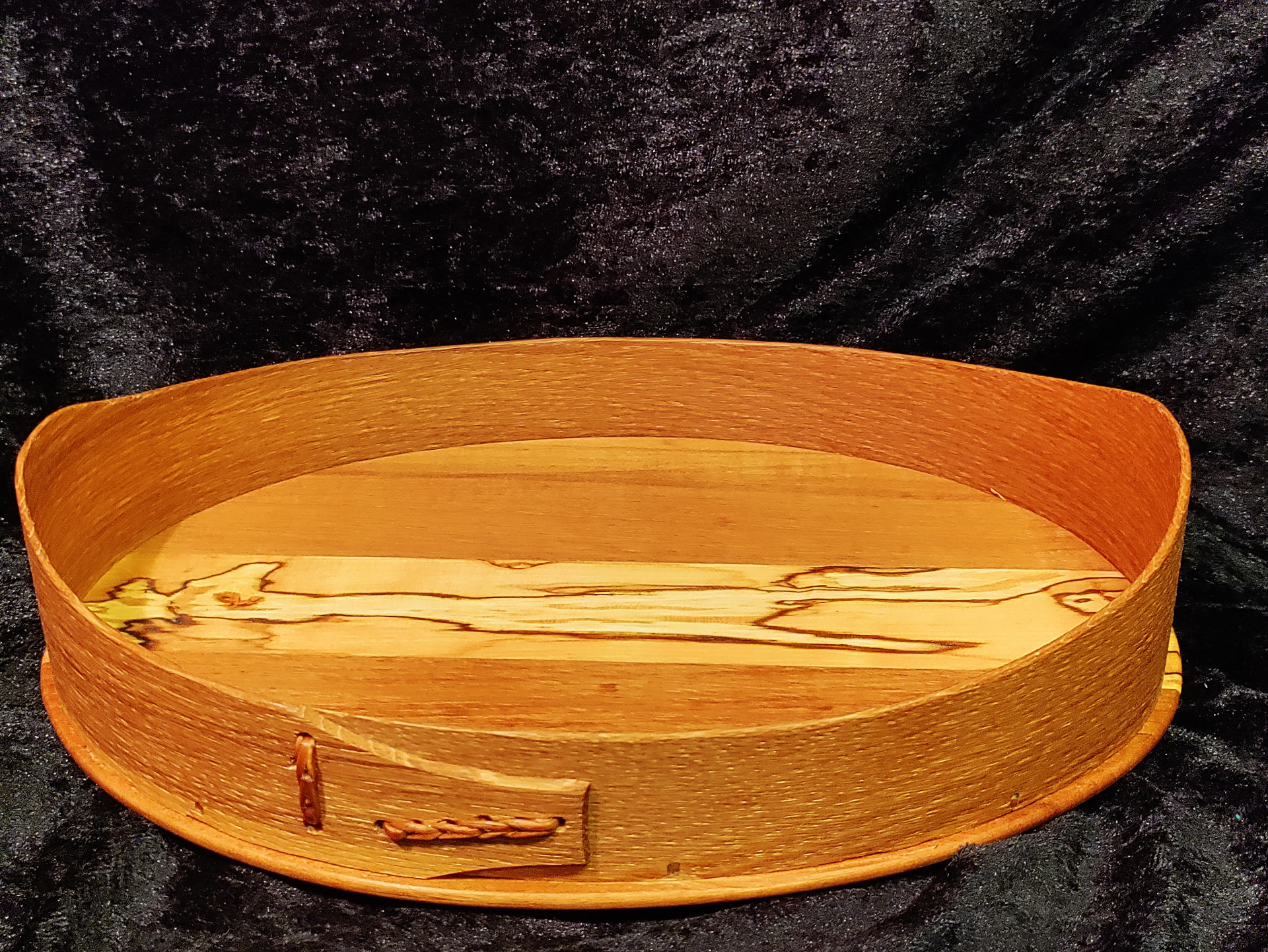 Litet svepfat, storlek ca 26x19cm. Svep av ek, botten av alm och rötad masurbjörk. Linoljad.