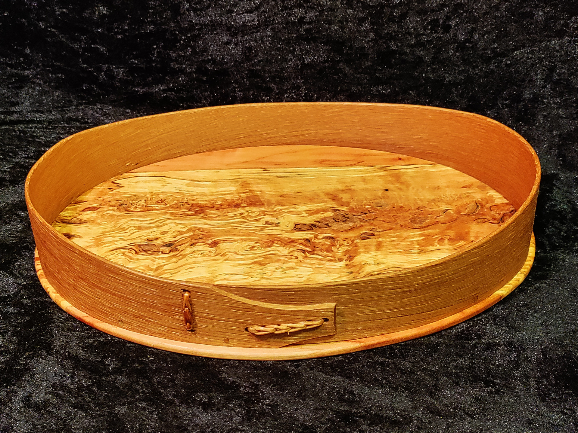 Svepfat. storlek ca 27x19cm. Svep av ek, botten av päronträ och lätt rötad masurbjörk. Linoljad.