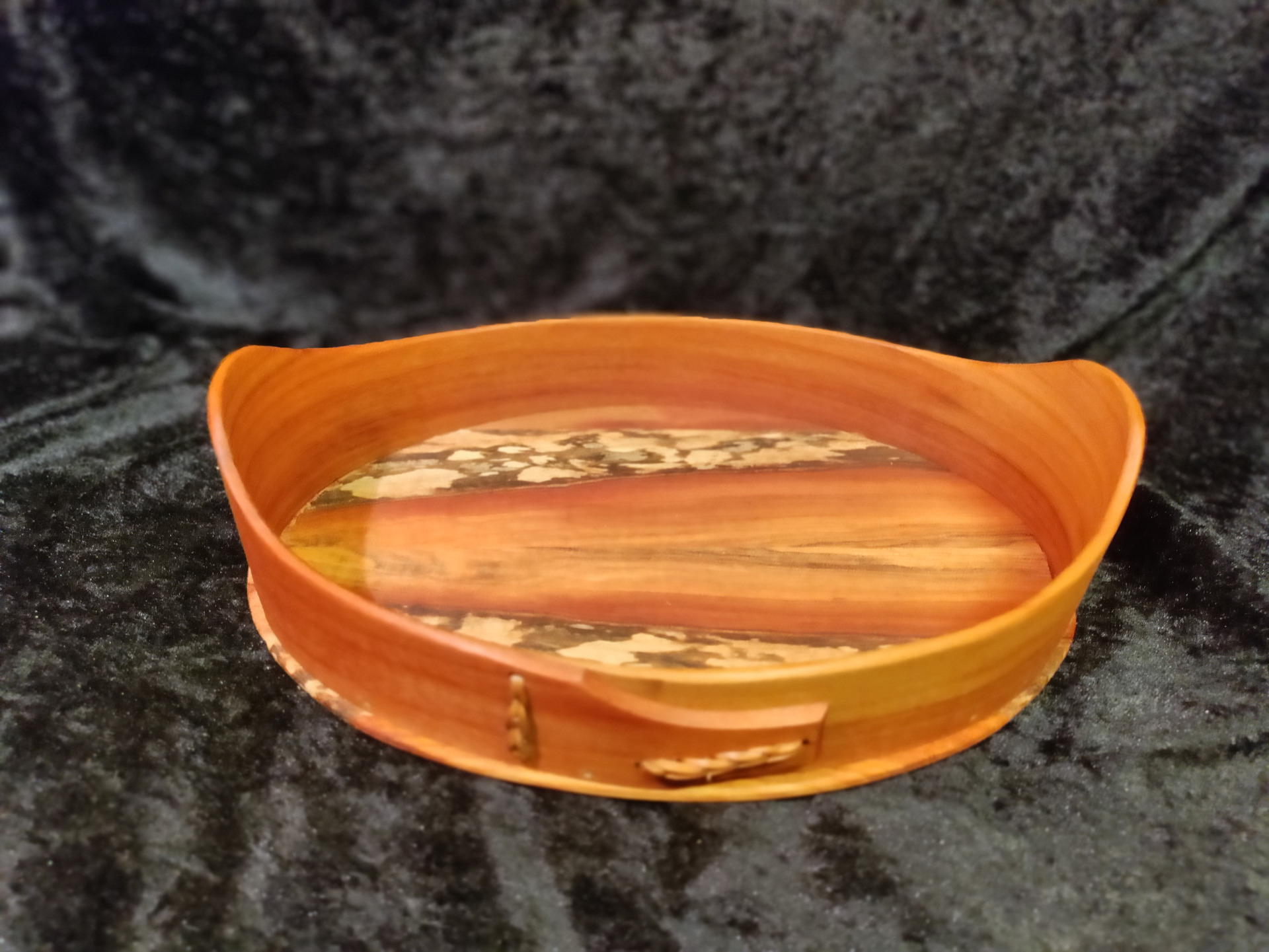 Svepfat. ca 24x16 cm. Svep av sälg, botten av päronträ, lätt rötad. Linoljad.